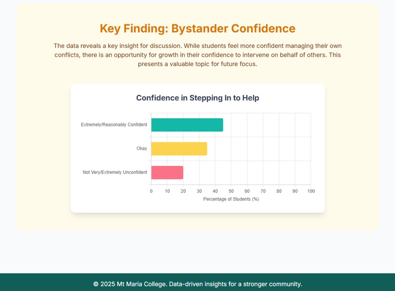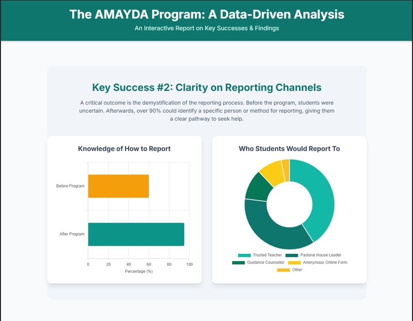 The following report was conducted by Mt. Maria College and emailed to us by their Pastoral Leader, Ian Sweeney, on 15 July 2025. He informed us that the survey was conducted over 170 Year-7 students before and after the program, with the time between pre and post program surveys being approximately 8 weeks. The survey details are copied below. The survey was conducted to measure the program’s impact on: