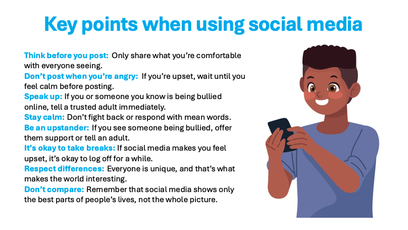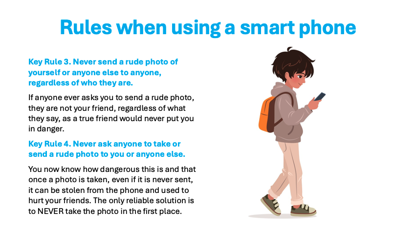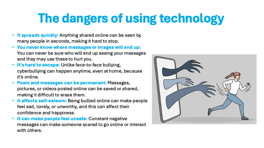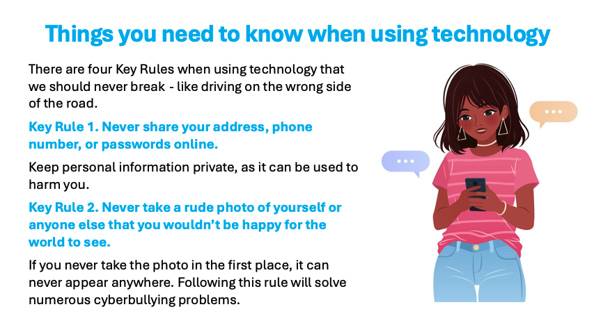 We want students to understand that it is their responsibility to use digital technology and social media in a way that respects their own and others’ safety. Much of this has to do with understanding how it works (for example that anything stored on your phone could be stolen) and using avoidance as a primary measure (such as not taking explicit photos in the first place).