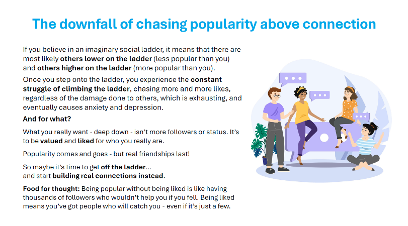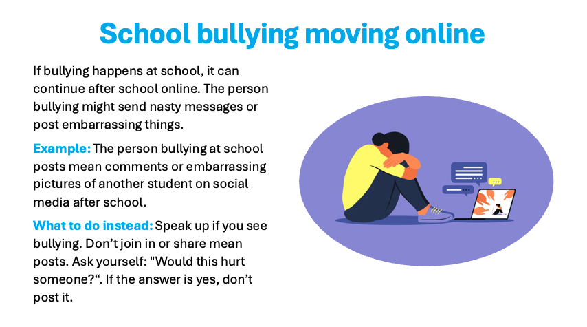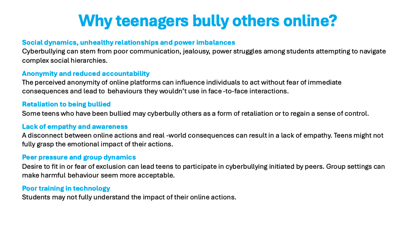 Students are guided to understand how cyberbullying starts in the first place, and it often starts with problems or conflict amongst peers. This frequently takes place at school first and then moves online. The online space is a convenient way of “getting back at someone”. It’s commonly used to embarrass, exclude or destroy someone’s reputation or self-esteem. Cyberbullying can become very serious, quickly, and in some cases, is illegal and can lead to dire consequences. Please see the link below if you would like to learn more about some of the implications with online offending: