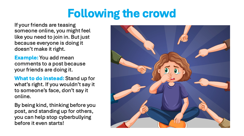 • Don’t gossip or talk badly about others and don’t post hurtful things online.