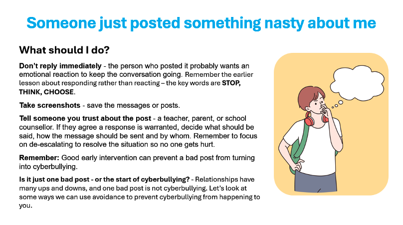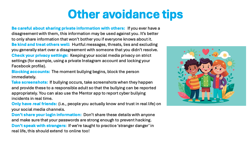 Throughout this program, there’s a common theme – that avoidance is the best strategy. When it comes to cyberbullying, there are a number of avoidance strategies students can use:
